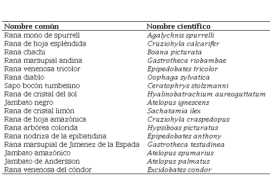 Esta empresa, en conjunto con el centro Jambatu, trabaja con 40 especies de anfibios, de los cuales 18 se encuentran en las instalaciones de Wikiri, como se menciona en la Tabla 1.