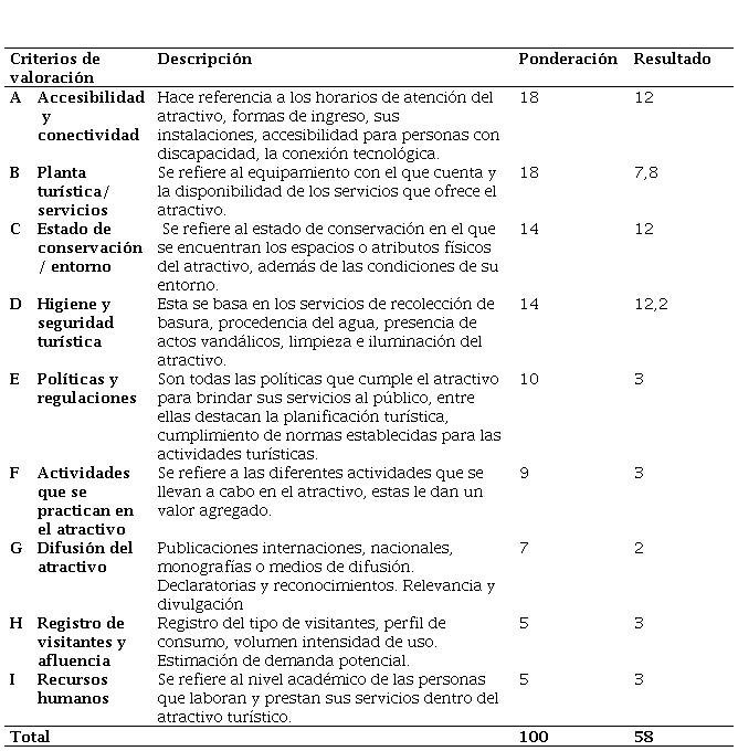 El lugar presentó una calificación de 58 puntos, lo que lo ubica en la jerarquía II, según el manual de jerarquización (MINTUR, 2017). La calificación obtenida demuestra el estado actual del recurso natural, con gran potencial turístico, sin embargo, no es capaz de motivar visitas por sí solo. Entre los diferentes aspectos que se consideraron para obtener esa clasificación, se encuentran: la accesibilidad para el sitio, el recorrido del sendero (el cual no presenta dificultad para los visitantes), sin embargo, no cuenta con rampas u otra infraestructura inclusiva para personas con discapacidad. Aunque el recorrido en su totalidad es plano, el sendero presenta un tramo de piedras y el resto es de vegetación, producto de la falta de mantenimiento.