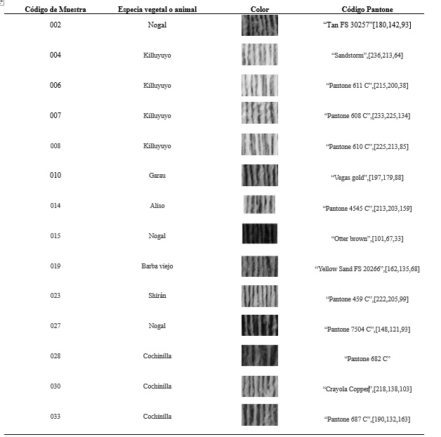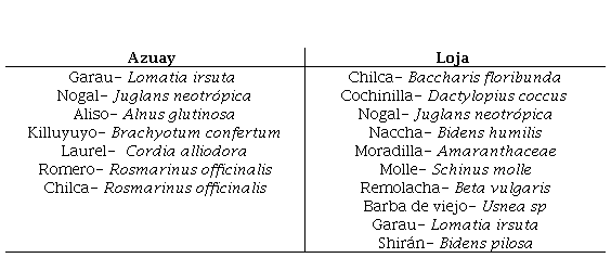 Las especies vegetales utilizadas fueron seis que corresponden a los nombres comunes de Barba de viejo, Nogal, Aliso, Killuyuyo, Garau y Shirán. Además, se utilizó cochinilla colorante de origen animal. Se consiguió el que se emplea en la industria alimentaria de origen peruano, y que es usado por algunos artesanos. En nuestro medio la cochinilla se produce en pequeñas cantidades, de forma espontánea y esporádica en Susudel, parroquia rural situada al sur de la provincia del Azuay.