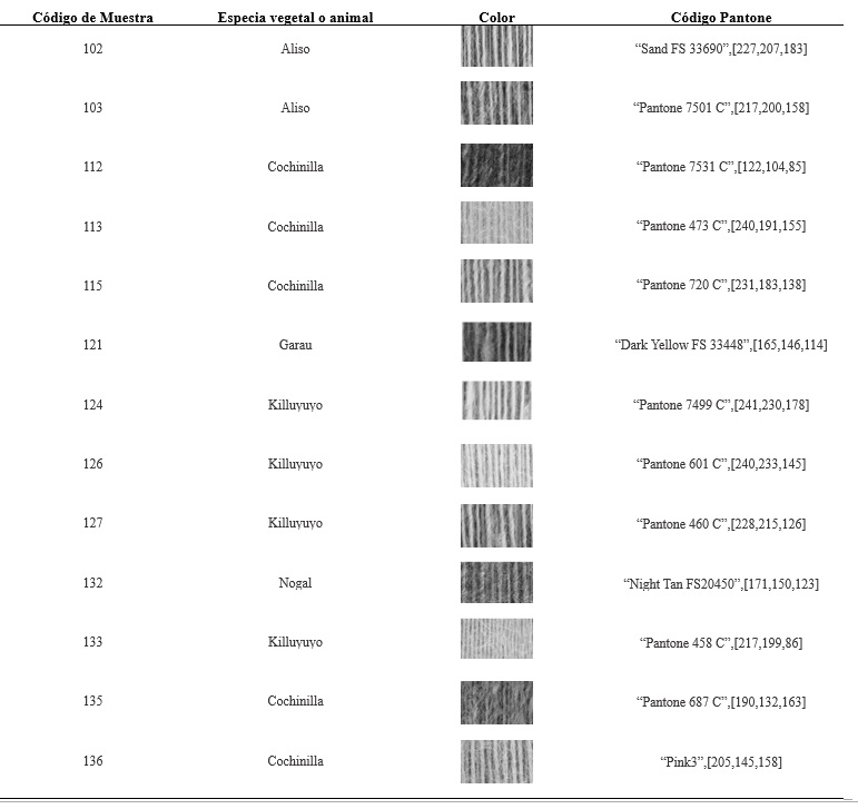 Los resultados de la indagación muestran que las técnicas ancestrales de tinturado natural se encuentran en peligro de desaparecer y las experimentaciones a nivel de laboratorio demostraron que con la optimización de los métodos tradicionales se mejoró la calidad del tinturado en cuanto a la intensidad aparente y a la solidez de los colores. El tinturado presentó mayor intensidad y brillo con el uso del mordiente alumbre, mientras que la variación del pH produjo una modificación del color a tonos más débiles. La aplicación de los colorantes extraídos de la mayoría de las especies vegetales principalmente de Branchyotum confertum (killuyuyo), Juglans neotrópica (nogal) y de la especie animal Dactylopius coccus (cochinilla) presentaron tinturados con una solidez al lavado, frote y exposición a la luz, con una valoración correspondiente a resultados satisfactorios según la escala de grises para la transferencia y cambio de color, no así el obtenido con la especie Alnus glutinosa (aliso) que presentó cambios de color inaceptables.