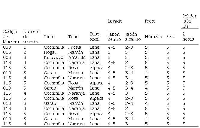 Las pruebas de calidad demostraron que el tinturado con la mayoría de vegetales ensayados tuvo la calificación de satisfactorio, lo que sirvió para demostrar que las técnicas ancestrales de teñido se pueden aplicar de una manera tecnificada para obtener mejores resultados.