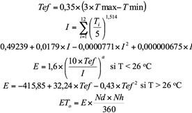 Donde: I es el índice de calor anual; Ti, la temperatura promedio mensual (°C); Tef, la temperatura efectiva (°C); E, la evapotranspiración mensual sin ajustar (mm m -1); Nd, el número de días del mes; Nh, la duración astronómica del día (h); ET 0, la evapotranspiración mensual corregida (mm mes -1).