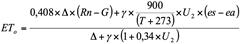 Donde: ET 0es la evapotranspiración de referencia (mm d -1); Rn, radiación neta en la superficie del cultivo (MJ m -2 d -1); G, flujo del calor de suelo (MJ m -2 d -1); U 2, velocidad del viento (m s -1); ea, presión real de vapor (kPa); es, presión de vapor de saturación; ?, pendiente de la curva de variación de la presión (kPa °C -1); T, temperatura promedio (ºC); ?, constante psicométrica (kPa oC -1); Z, elevación sobre el nivel medio del mar; ?, calor latente de vaporización (MJ kg -1).
