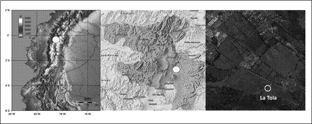 El área de estudio para la presente investigación se estableció en el Valle de Tumbaco, localizado en la República del Ecuador, provincia de Pichincha, ubicado en la cuenca alta del río Esmeraldas. Se utilizó información de la estación agrometeorológica La Tola (M002) perteneciente al Instituto Nacional de Meteorología e Hidrología (INAMHI), localizada a una altura de 2.480 m, a 0º13'46'' de latitud sur y 78º22'0'' de longitud oeste ( Figura 1). La serie histórica mensual de datos va desde 1986 hasta 2018 (32 años).