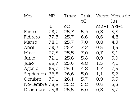 Las condiciones agroecológicas del valle de Tumbaco se caracterizan por tener dos estaciones climáticas bien diferenciadas: la lluviosa de octubre a mayo, y verano de junio a septiembre; durante los meses de julio y agosto se presentan vientos fuertes, mayor insolación y temperaturas máximas y mínimas; la humedad relativa máxima mensual se registra en el mes de abril con el 79,20% (mes más lluvioso) y la mínima en el mes de agosto con el 65,70% (mes más seco); la temperatura máxima varía entre 25,4ºC y 26,6ºC, la temperatura mínima varía entre 4,8ºC y 7,3ºC; la velocidad del viento máxima se registra en el mes de agosto con 1,70 m s -1 y la mínima en el mes de abril con 0,50 m s -1; el mes con el mayor número de horas de luz es agosto con 7,50 h d -1 y el mes con el menor número de horas de luz es abril con 4,3 h d -1(Tabla 1).