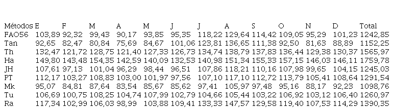 Considerando el total anual de ET 0 ( Tabla 3, columna 14) y el método FAO56 como base, el tanque evaporímetro proporcionó un valor de ET o inferior del 7,29%; Thornthwaite modificado un valor superior del 26,0%; Hargreaves un valor superior del 41,59%; Jensen and Haise un valor mayor del 0,18%; Priestley and Taylor un valor superior del 3,92%; Makkink un valor inferior del 11,59%; Turcun valor superior del 1,46% y FAO Radiación un valor superior del 11,87%.