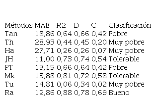 El método Jensen and Haise para información climatológica de toda la serie histórica de datos presentó un desempeño tolerable ( Tabla 4), mientras que para el año de máxima y mínima ET 0índices muy pobres ( Tabla 5).