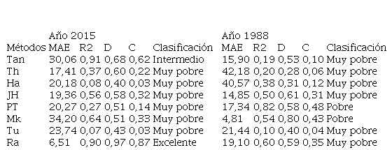 El método que presente un mayor índice de confiabilidad se analizará para los años de máxima (2015) y mínima (1988) evapotranspiración anual, para determinar su grado de precisión en condiciones extremas.