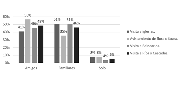En la Figura 7, se muestra que los turistas del cantón en su mayoría prefieren realizar cualquiera de las actividades turísticas en compañía de amigos y familiares. Cabe señalar que las diferentes actividades propuestas no tienen una diferencia amplia entre sí y por tanto, como se demostró en el gráfico anterior, todas las actividades son aceptadas o consideradas por el visitante.