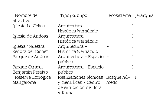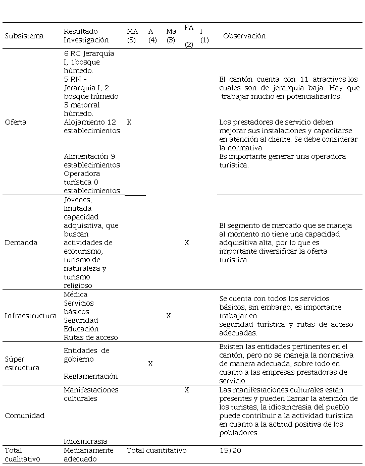 Los recursos culturales que se muestran en la Tabla 2 han permitido a las autoridades del cantón planificar el potencial para la tendencia de turismo religioso, ya que según María Sandoval (2019), técnica de turismo del cantón, cada iglesia ?cuenta con diversos objetos y reliquias religiosas que poseen gran valor patrimonial?. Cabe destacar que no se han considerado recursos artesanales y gastronómicos ya que estos son tomados en cuenta en el subsistema comunidad. Por otro lado, los recursos naturales y culturales en el área son más potenciales que reales, debido a que se realiza turismo de manera informal, según López Olivares (2001) cuando la oferta se da de manera espontánea y sin mayor estructura organizativa los recursos se mantienen como tal y no logran ser un producto turístico, que es lo que pasa en la zona.