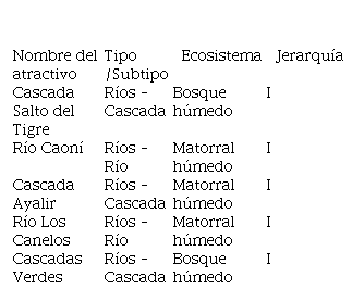 En la Tabla 1 se observa la jerarquización de los atractivos naturales más representativos del cantón PVM, se evidencia que la ponderación se encuentra entre 10 y 35 puntos, por lo cual pertenecen a la jerarquía I. Dichos recursos turísticos naturales están ubicados en ecosistemas de bosque siempreverde, piemontano, específicamente bosque húmedo y matorral húmedo; en este sentido, la variedad de estos recursos permite que el territorio tenga potencial para practicar la modalidad de ecoturismo.
