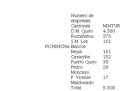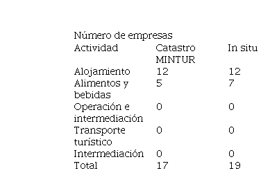 Según el Ministerio de Turismo, como se presenta en la Tabla 4, existen 12 empresas dedicadas al alojamiento y 5 de alimentos y bebidas, mientras que en la visita in situ se consignaron 12 empresas de alojamiento y 7 de alimentos y bebidas, lo que muestra una discrepancia en la información y lleva a considerar que existen empresas que no se encuentran registradas en el catastro. La actividad de operación e intermediación no cuenta con un solo establecimiento, sin embargo, en la aplicación de la entrevista a Henry Cárdenas (2019), guía local del cantón, certificado por el Ministerio de Turismo, se establece que ?existe una asociación de guías locales que están trabajando para la implementación de una agencia turística en el territorio?, lo que hace pensar, nuevamente, que la práctica del turismo en la zona no está regulada ni organizada.