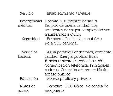 Es el conjunto de obras y servicios que permiten el desarrollo socioeconómico de un territorio y que el turismo utiliza para impulsar diversas actividades, entre las que se encuentran rutas de acceso, servicios de comunicación y equipamiento urbano ( Universidad para la Cooperación Internacional, 2019). En cuanto a la infraestructura del cantón Pedro Vicente Maldonado ( Tabla 5) se puede manifestar que cuenta con las condiciones mínimas para la ejecución de actividades turísticas; sin embargo, cabe recalcar que es necesario mejorar las rutas de acceso a los atractivos y la señalización en los mismos. Además, se debe considerar la necesidad de ampliar la red de seguridad y el acceso a internet.
