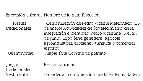 La idiosincrasia según Sánchez (2012) es la manifestación de la cultura, centrada en un grupo de la sociedad más bien homogéneo, con características y factores comunes, que generalmente se dan por cercanía geográfica, por lengua o nacionalidad. Los pobladores Pedro vicentinos tienen un modo de vida rural campestre como se muestra en la tabla 8, debido a que la mayoría de su población son agricultores y ganaderos, como lo afirma el Instituto Nacional de Estadística y Censos (2010) con un 50,7% de actividades realizadas por los pobladores. Se observa un gran apego religioso debido a que la población cuenta con reliquias religiosas de gran valor. Los habitantes tienen disposición positiva para promover la actividad turística, aunque carecen de conocimiento y apoyo técnico.