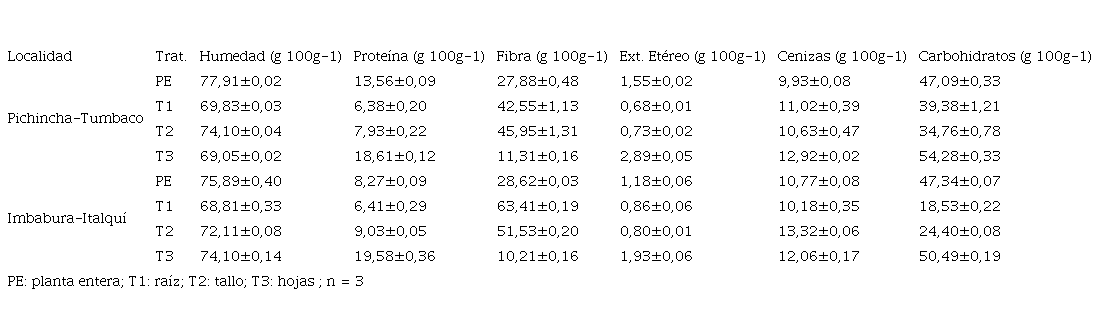 El análisis proximal que comprende la determinación de los porcentajes se realizó en la planta entera y en sus partes. Los métodos de análisis aplicados se encuentran descritos en el manual del laboratorio ( INIAP, 2017). Se consideraron los siguientes parámetros: la humedad obtenida por evaporización del agua al someter la muestra al calor en una estufa de aire forzado (Lab-Line IMPERIAL V) (MO-LSAIA-01.01); la proteína se analizó por el método Kjeldahl (FOSS Tecator) (MO-LSAIA-01.04); la fibra obtenida en el analizador (LABCONCO) es el residuo de una digestión ácida y alcalina (MO-LSAIA-01.05); el contenido graso se extrajo con hexano en un analizador (FOSS Soxtec TM 2043) (MO-LSAIA-01.03); las cenizas se obtuvieron por la incineración en una mufla (Thermolyne 48000 Furnace) (MO-LSAIA-01.02); los carbohidratos totales se obtuvieron por diferencia del 100 % del contenido de fibra, grasa, proteína y cenizas (MO-LSAIA-01.06). En el contenido de macro y microminerales, se determinó el fósforo por espectrofotometría UV/VIS (Shimadzu Uv-2600) (MO-LSAIA-03.01) y por espectrofotometría de absorción atómica (Shimadzu AA-7000) el Ca, Mg, Na, K, Cu, Fe, Mn, Zn (MO-LSAIA 03.02).