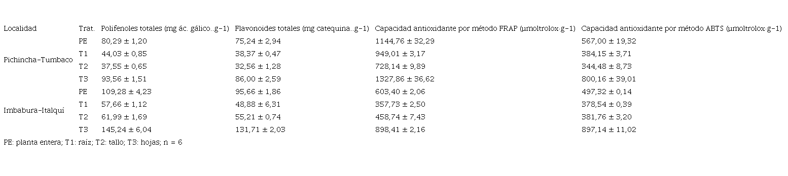 En la Tabla 2 se presentan los resultados de los compuestos funcionales y la capacidad antioxidante. Se puede observar que el orégano de Italquí tiene mayor contenido de polifenoles y flavonoides, tanto en la planta entera como en sus partes, con el mayor contenido en las hojas con 145,24 y 131,71 (mg g -1), los valores que se obtuvieron en Tumbaco fueron de 93,56 y 83,00 (mg g -1), respectivamente. Por el contrario, los contenidos menores son en el tallo y las raíces. El aporte en los valores de la planta entera se debe al alto contenido que tienen las hojas.