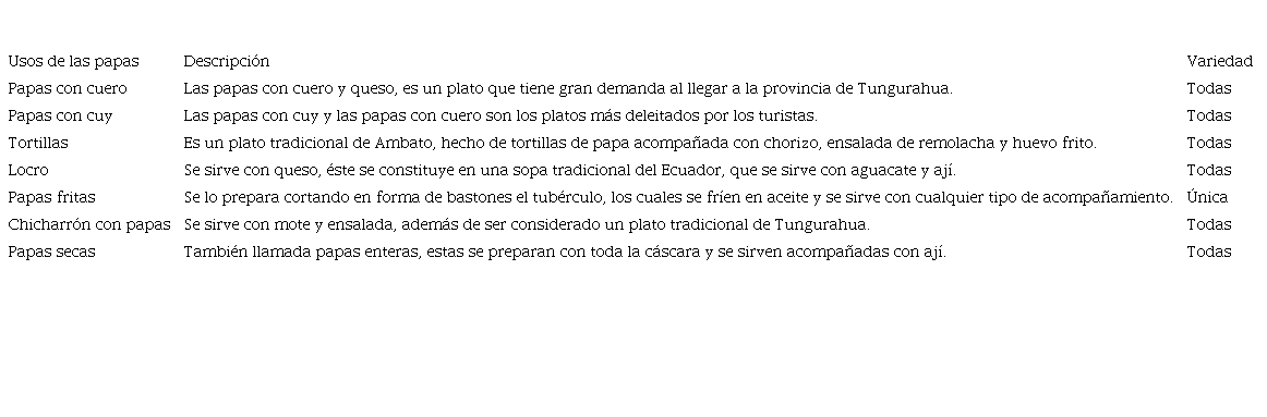 Seguido, en la Tabla 6se muestra cómo los agricultores usan todas las variedades de papa en varios platos típicos, dichas variedades de papa se caracterizan por poseer un sabor único y generar efecto notable en la preparación y presentación, por esta razón se conserva la diversidad de variedades nativas de papa en sus parcelas. En el estudio realizado por Monteros et al. (2005) las características para el uso de las variedades nativas son su buen sabor, su textura, que va de ligeramente arenosa a arenosa; además del tiempo de cocción que va de 10 a 25 minutos a diferencia de las variedades mejoradas que se demoran 30 minutos. Las principales preparaciones en el estudio de Monteros et al. (1999) coinciden en locros, con cáscara o papas secas, fritas. Mientras que en el estudio de Cóndor (2018), presenta una gama de platos gourmet que se pueden preparar con la papa, como son: crepe de papa, croquetas, pastel de papa, etc., a diferencia de nuestro estudio que se presentan platos, tales como las tortillas, papas con cuy y papas con cuero.