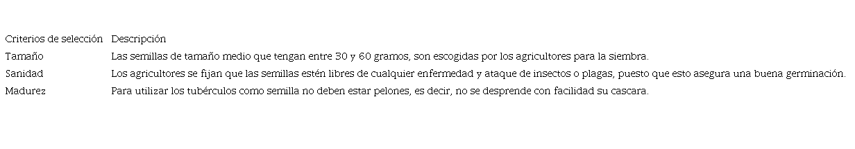 En la Tabla 5 se observa que para la selección de semilla se toman en cuenta varios criterios, entre ellos están el tamaño, la sanidad y el color, todas estas cualidades ayudan al agricultor a escoger una buena semilla para el próximo cultivo y así asegurar una producción de buena calidad y cantidad.