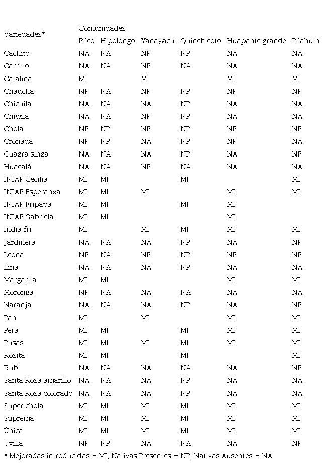 En la Tabla 4 se puede observar el comportamiento de las variedades reportadas en los GF en cada comunidad, si se trata de una variedad nativa presente, ausente o mejorada introducida, se puede atribuir estos cambios a las demandas actuales de la sociedad, y los cambios de hábitos del consumidor, dando como resultado que la papa nativa tenga preferencia por el agricultor y un limitado segmento de la población, los cuales reconocen las características que las diferencian de las demás, cabe también mencionar que se registra la existencia de 14 variedades mejoradas introducidas (Suprema, INIAP Cecilia, INIAP Esperanza, Margarita, Súper chola, Catalina, India frit, INIAP Gabriela, INIAP Fripapa, Rosita, Única, Pan, Pera y la variedad Pusas, de la cual se desconoce su origen), los agricultores cultivan variedades mejoradas ya que se obtiene una mayor productividad y ellos pueden comercializar en los diferentes mercados de la zona.