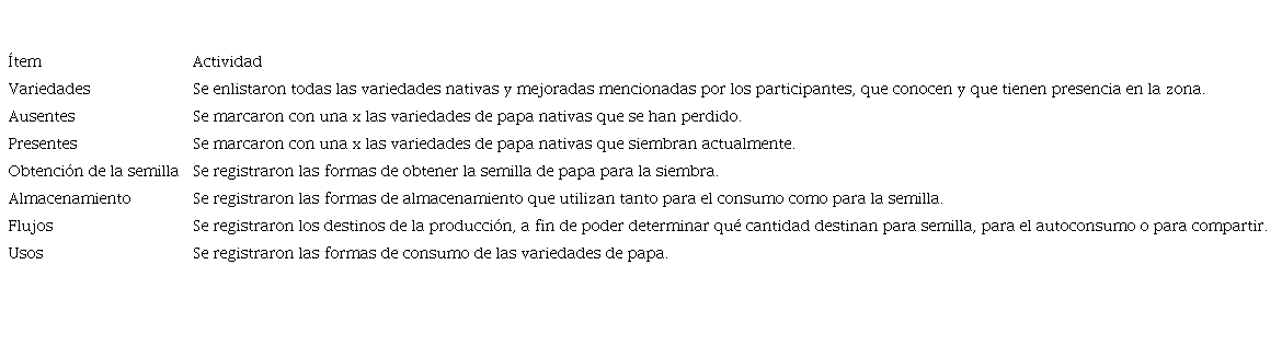 Se identificaron 32 variedades de papa, de las cuales 14 son variedades mejoradas introducidas, y 18 son variedades nativas presentes. La forma más común utilizada por los agricultores para obtener semillas de papa es el reciclaje con el 78 %, en menor porcentaje está la compra en bodegas con el 2 %, y entre las formas intermedias están el intercambio, raciones y la chala con 12 %, 4 % y 4 %, respectivamente. Las formas más frecuentes de almacenar las semillas de papa son en sacos y en pilos. Se identificaron 7 formas diferentes de preparación en las cuales se utilizan todas las variedades de papa para la elaboración de platos típicos de la zona. El destino de la producción corresponde en un 65 % para los mercados, el resto de la producción es utilizado para autoconsumo, semilla y para alimentación animal.