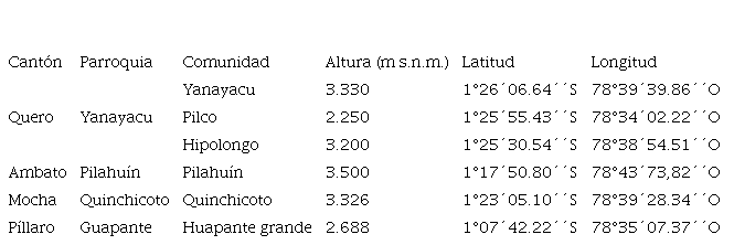 La investigación se realizó en seis comunidades de la provincia de Tungurahua: Pilco, Hipolongo, Yanayacu, Pilahuín, Quinchicoto y Huapante grande ( Tabla 1).