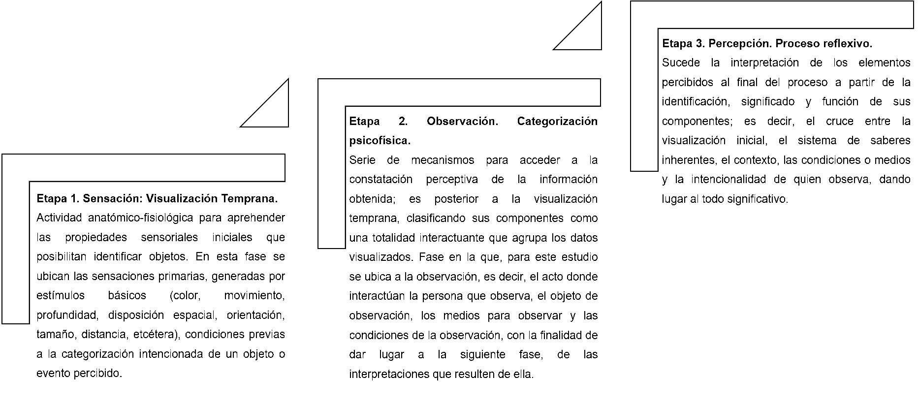 Bajo ciertas circunstancias, la resultante del procesamiento de la información percibida por las personas se da de forma no consciente, es decir, el observador considera que no ha detectado o experimentado cierto aspecto de su entorno vital. De hecho, parte importante de los hechos visuales (excepto el reconocimiento, connaturalmente ?consciente?) tiene lugar fuera de la conciencia del sujeto ( Aznar-Casanova, 2018). La percepción es considerada como el conjunto aditivo de niveles de acercamiento a las partes de un objeto considerado como una totalidad; en este sentido, se ubican tres niveles de aproximación hacia el mismo, a manera de continuo ( Aznar-Casanova, 2018), como se observa en la Figura 1.