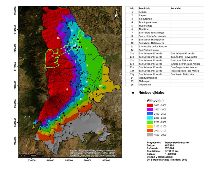 En este estudio, las comunidades se clasificaron con base en su ubicación y gradiente altitudinal en comunidad alta, media y baja, respectivamente, todas pertenecen a la cuenca alta del río Atoyac. La información se obtuvo por observación participante, geolocalización, la aplicación de un cuestionario estructurado y precodificado con un total de 40 preguntas divididas en 5 secciones y entrevistas a las personas clave, todas mujeres.