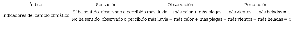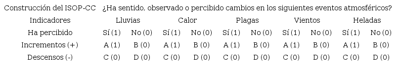 Las variables o indicadores para elaborar el índice de sensación-observación-percepción del cambio climático (ISOP-CC) fueron los atributos subjetivos y objetivos, derivados de la sensación, observación y percepción del cambio climático por las mujeres entrevistadas, mismos que se dirigieron a registrar si han sentido y observado los siguientes elementos meteorológicos con sus respectivos impactos: 10a) lluvias, 10b) heladas, 10c) vientos, 10d) calor y 10e) plagas, versus su percepción de incremento o descenso hacia los mismos.