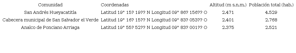 El universo de estudio comprendió tres localidades ubicadas en el municipio de San Salvador el Verde, cuyas coordenadas geográficas, altitud y población total se recogen en la Tabla 2. En la Figura 2 observamos los gradientes altitudinales presentes en el municipio de San Salvador el Verde. Las comunidades de estudio son 13a, 13b y 13d.