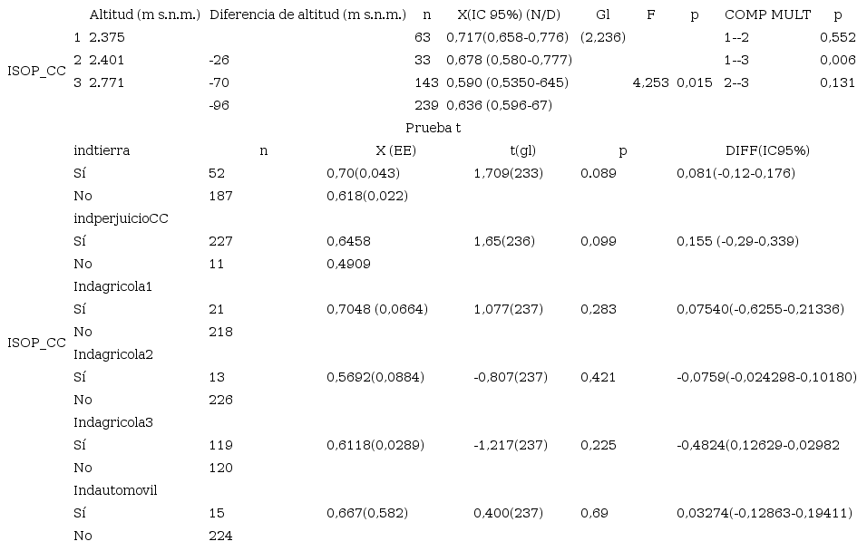 Para medir la altitud, ésta se dividió en dos variables Dummy para medir el impacto de ISOP-CC a nivel de cuenca. En el nivel más alto de la cuenca, que corresponde a la comunidad de San Andrés Hueyacatitla, el 59% de las mujeres percibió el cambio climático y el 41% no. En el nivel medio que corresponde a la comunidad de la cabecera municipal de San Salvador el Verde el 68% de mujeres percibió cambio climático y el 32% no. En el nivel bajo que corresponde a la comunidad de Santa Cruz Analco, 72% de las mujeres percibió el cambio climático y el 28% no. El análisis de varianza (ANOVA) demuestra que hay evidencia estadística significativa con base en la altitud de las tres comunidades de estudio (F = 4,25; gl = 2; p = 0,015). Este fue el principal predictor del índice de sensación-observación-percepción del cambio climático (ISOP-CC) entre las mujeres ( Tabla 5).
