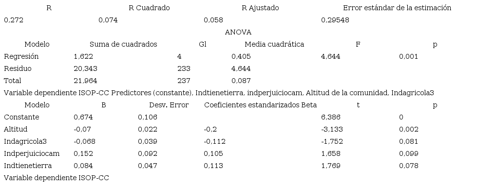 Las variables significativas y marginalmente significativas fueron incluidas en un modelo de regresión cuyo resultado es: ISOP-CC = Constante + Comunidad 1-3 + Comunidad 2-3 + perjuicios atribuidos al CC (1,0) + tenencia de la tierra del grupo doméstico (1,0) y tiempo de la primera observación cambio climático (años).
