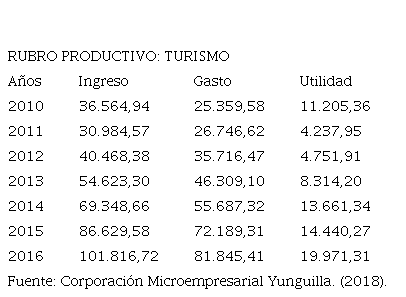 Se observa que los ingresos generados por la oferta de los servicios y productos turísticos de la comunidad de Yunguilla, menos los gastos de operación turística de la Corporación Yunguilla, permitieron obtener una utilidad promedio de US$ 10.940,33 en cada año ( Figura 1), los mismos que fueron reinvertidos en proyectos de la comunidad.