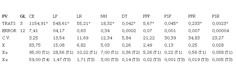 En los resultados obtenidos se observaron diferencias significativas (? ? 0,05) entre los tratamientos para todas las variables de estudio, como se aprecia en la Tabla 1.