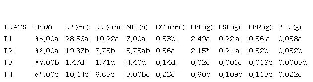En la Tabla 2se muestran los resultados de la comparación de medias de las variables de estudio. La CE fluctuó entre 59 y 95%. El T1 presentó el mayor porcentaje de emergencia (95%), seguido del T2 (94%), el T4 fue el sustrato que mostró el porcentaje más bajo; se observa que los primeros tres tratamientos fueron superiores a la media general. Para la LP los valores muestran que T1 fue el que tuvo una mejor altura con 28,56 cm, seguido del T2 con 19,87 cm, y el menor T3 con 1,47 cm. En la variable LR se observó que el valor máximo lo obtuvo el T1 con 10,22 cm y el mínimo el T3 (1,71 cm). Con respecto a las variables NH, los tratamientos T1 y T2 fueron estadísticamente iguales presentando los valores máximos. La única variable donde el T1 no presentó el valor máximo fue en DT, ya que T2 reveló el mayor diámetro.