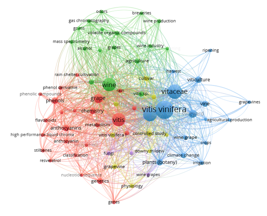 Se realizaron tres búsquedas debido a un enfoque desde lo general a lo particular. En la Figura 3 se presentan los resultados de la primera búsqueda, y en la Figura 4 la Coocurrencia de esta búsqueda, elaborado con el programa VOSviewer. Del análisis de concurrencia de palabras clave, se identificaron como relevantes “vitis vinifera”, “wine” y “grape”, asociadas a los clústeres principales.