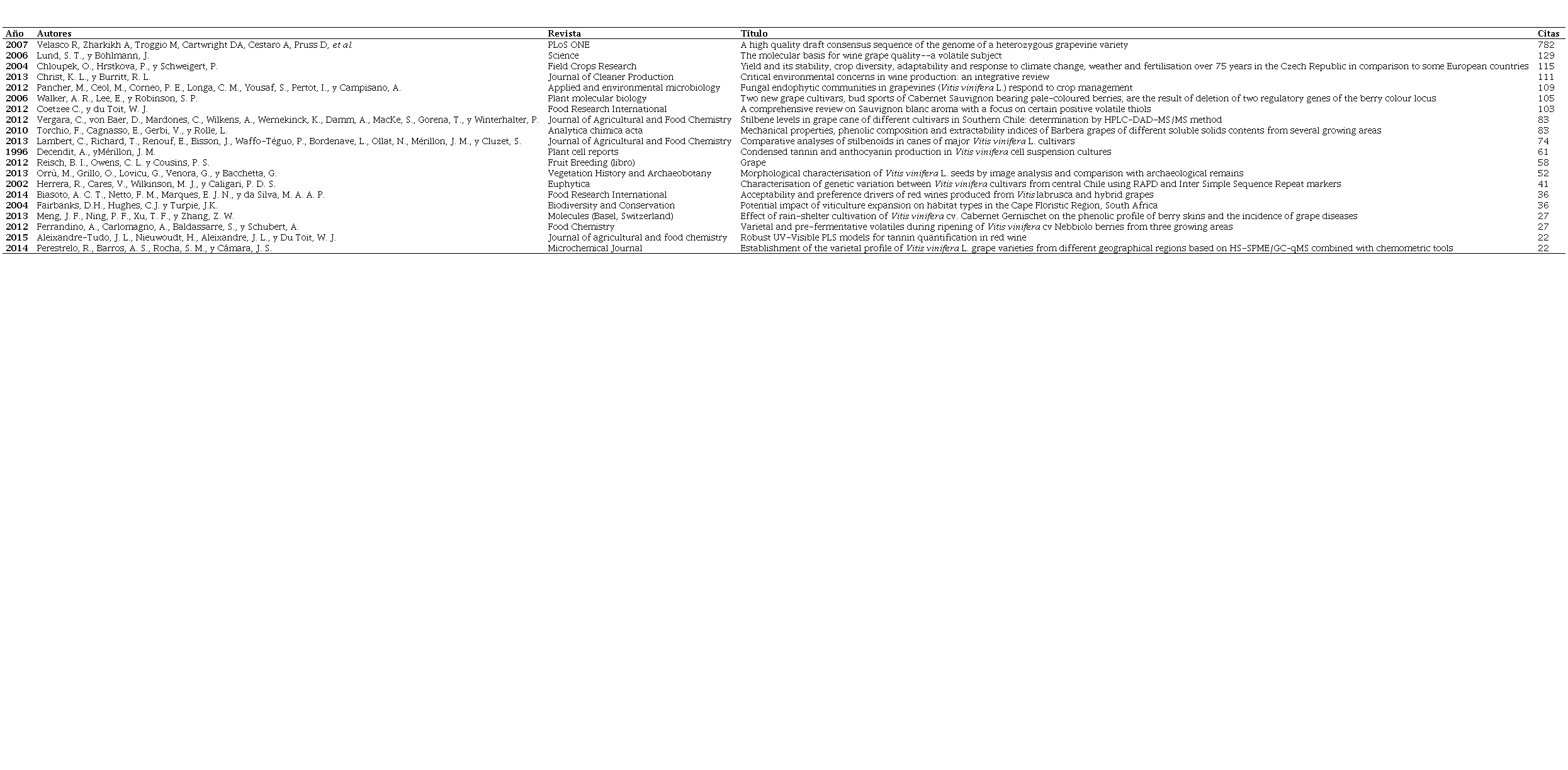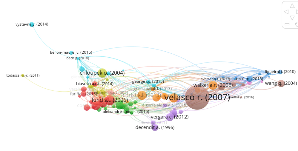 En el indicador bibliométrico relacionado con los documentos más citados del tema resaltan los textos de Velasco et al. (2007), Lund y Bohlmann (2006), Chloupek et al.(2004), Walker et al. (2006) y Aleixandre-Tudo et al. (2015). La Tabla 1 derivada del análisis en Bibliometrix corrobora el acople bibliográfico.
