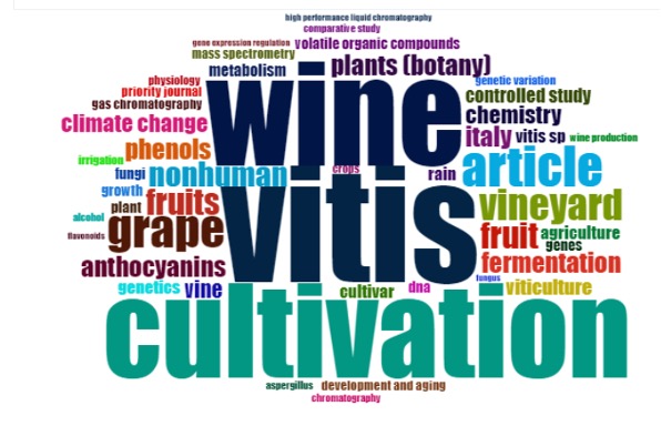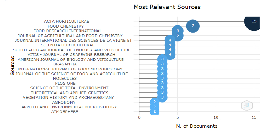 Las fuentes principales de información del tema son las revistas: Act Horticulturae, Food Chemistry, Food Research International y el International Journal of Vine And Wine Sciences (Figura 5). Finalmente, se realizó en Bibliometrix un análisis sobre la frecuencia de las palabras clave en los documentos, arrojando como resultado la nube de palabras representada en la Figura 6.