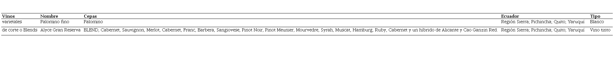 Vinos de corte o Blends: Se trata de mezclar vinos de distintas cepas, van de dos, tres o más cepas, con esto se obtiene mejores características sensoriales de las que se obtuvieron con las cepas solas, también logra mejorar características químicas deficientes en los vinos ya creados. Ecuador posee vinos de corte creados por los fines antes descritos que han resultado en vinos de altísima calidad (Tabla 3).