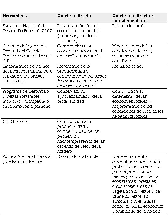 Es objetivo general de la Política Nacional Forestal y de Fauna Silvestre (Ministerio de Agricultura y Riego [MINAGRI], 2017, p. 23) “Contribuir con el desarrollo sostenible del país, a través de una adecuada gestión del Patrimonio Forestal y de Fauna Silvestre de la Nación, que asegure su aprovechamiento sostenible, conservación, protección e incremento, para la provisión de bienes y servicios de los ecosistemas forestales, otros ecosistemas de vegetación silvestre y de fauna silvestre, en armonía con el interés social, cultural, económico y ambiental de la Nación”. En la presentación de la Política Nacional Forestal y de Fauna Silvestre (MINAGRI, 2017, p. 5) se señala que “El Estado peruano declara de importancia nacional el desarrollo forestal y de fauna silvestre que se traduce en la generación de bienestar y oportunidades de desarrollo para la población nacional”. En la Tabla 1 se muestra los objetivos directos e indirectos del desarrollo forestal expresados en la institucionalidad y las herramientas de gestión forestal en el Perú.