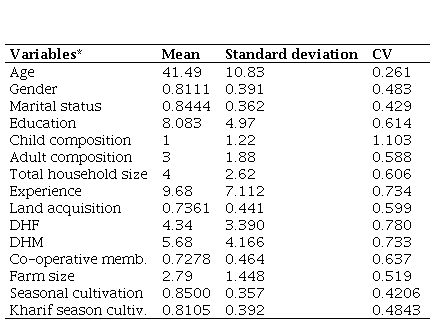* DHF and DHM are Distance from House to Farm and Distance from House to Market respectivelyHowever, the enterprise is gender biased (81.11 % of male farmers) and this may be attributed to gender stereotype which hinders women from access to and control over productive resources. Women face many constraints despite playing a pivotal role in food production, the chief being landless with no assets in their name. Even if they have land, they are constrained by money and other resources needed for cultivation (inputs and technical know-how). This depicts that the studied area did not recognize farm women as ‘farmers’ rather ‘wives’ of the farmers. Thus, it can be suggested that women are very vulnerable or susceptible to the vicious cycle of poverty as they have little or no title of economic ownership.