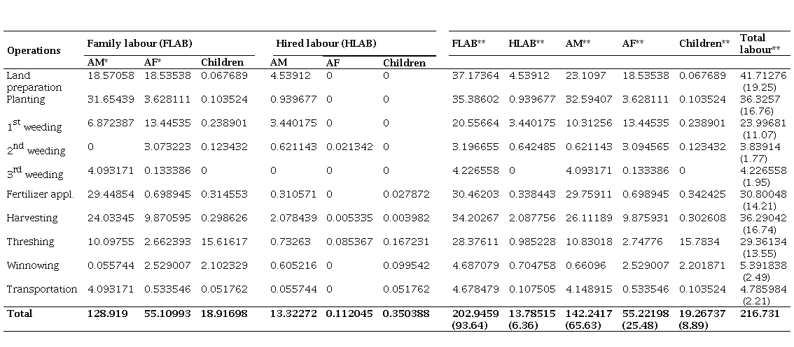 Most of the labour used for the farm operations was sourced from family labour (93.64 %) which is cheap and almost free while hired labour contribution was marginal (6.36 %). Thus, high reliance on family labour revealed the poor economic position of the farmers as most of them are resource-poor cultivating rice on thinly uneconomic holdings. In addition, farm families spend most of their time during the cropping season on farm activities. This suffices that children spend valuable school hours on farm activities all in an effort to supplement family labour due to the poor capital position of the farmers to improvise for paid labour.