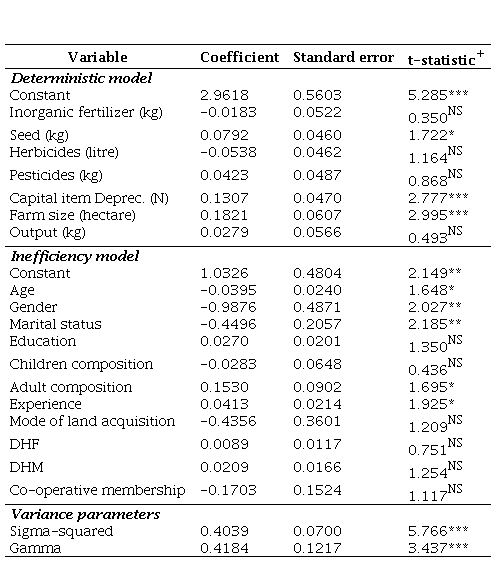 Though, non-significance associated with inheritance, distance of farm from home, distance of home from market and cooperative membership coefficients convey useful information. The negative sign of inheritance coefficient implies that the ability to enhance land productivity viz. reclamation among farmers that inherited their farm lands enhanced their labour efficiency. Farmers with farmland far away from their homes are more labour efficient as there is little or no distraction that are likely to emanate from their abodes, thus more valuable time is spent on the farm. However, farmers that have their homes close to the markets spent most of their valuable time in non-farm and off-farm market activities than on-farm activities; thus affected their farm labour efficiency. The pecuniary advantages benefited by farmers that belongs to cooperative associations made them to be more labour efficient than their counterparts who had no cooperative membership.