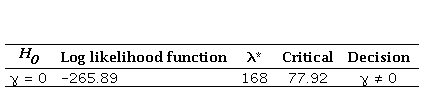 Where, H0 is the value of the likelihood function for the unrestricted frontier (OLS) while Ha is the value of the likelihood function for the restricted Cobb-Douglas frontier model. Thus, if the calculated Chi2 is greater than the tabulated Chi2 at 5 % degree of freedom, then the null hypothesis is rejected in favour of alternative hypothesis. The alternative hypothesis has approximately a mixed Chi2 distribution with a degree of freedom equal to the number of parameters omitted in the unrestricted model, if the null hypothesis is true (Sadiq & Singh, 2016).