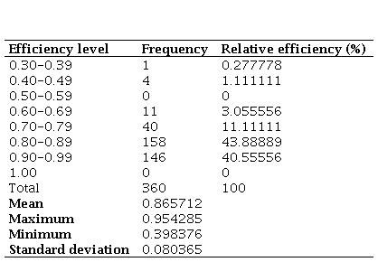 Given the level of technology at the disposal of a technical unit, the labour-use efficiency is expressed as the ratio of the observed labour-use (Lb) to the corresponding optimum labour requirement ( Lopt), and it is given in equation [2].