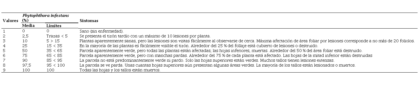 Para la toma de datos de severidad se tomaron puntos equidistantes por cada unidad experimental, cuyos criterios de selección fueron plantas sin anomalías fisiológicas, daños causados por bacterias y virus. Para cada muestreo se tomaron 5 surcos centrales por cada unidad experimental y se evaluaron 30 plantas por unidad experimental semanalmente durante los meses de diciembre de 2015 a mayo de 2016, el sistema de seguimiento se realizó a través de lecturas del porcentaje de área foliar afectada, utilizando percepción visual desde el tercio inferior hasta el tercio superior de las plantas evaluadas registrándose el porcentaje de severidad de 0 a 100 % coincidiendo con Pérez y Forbes (2008), quienes afirman que los porcentajes de área foliar afectada son: 0 % = planta sana y 100 % = planta muerta, y cuyas lecturas de evaluación coinciden con la escala reportada por el Centro Internacional de la Papa (Tabla 1).
