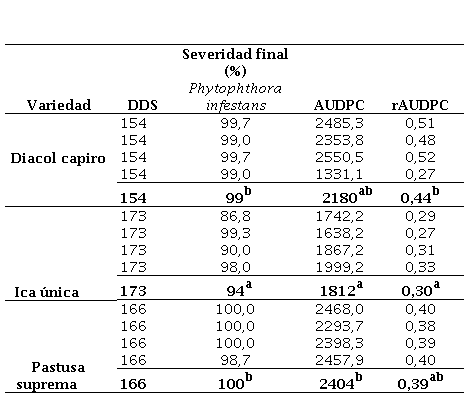 Table 2. Response of late blight of Diacol Capiro, Ica Unica and Suprema varieties. Days after planting (DDS) and final severity (%), area under the disease progress curve (AUDPC), development rates (rAUDPC). Means with different letters indicate significant statistical differences (Duncan, p ≤ 0.05) between varieties (30 evaluations per plot in four replications).