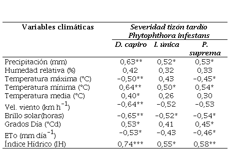 Table 3. Correlations of climatic variables and severity of late blight in potato (Solanum tuberosum L.) cv. Diacol Capiro, Ica Unica and Pastusa Suprema at the Tibaitatá Research Center, Corporación Colombiana de Investigación Agropecuaria (AGROSAVIA), Mosquera, Cundinamarca – Colombia.
