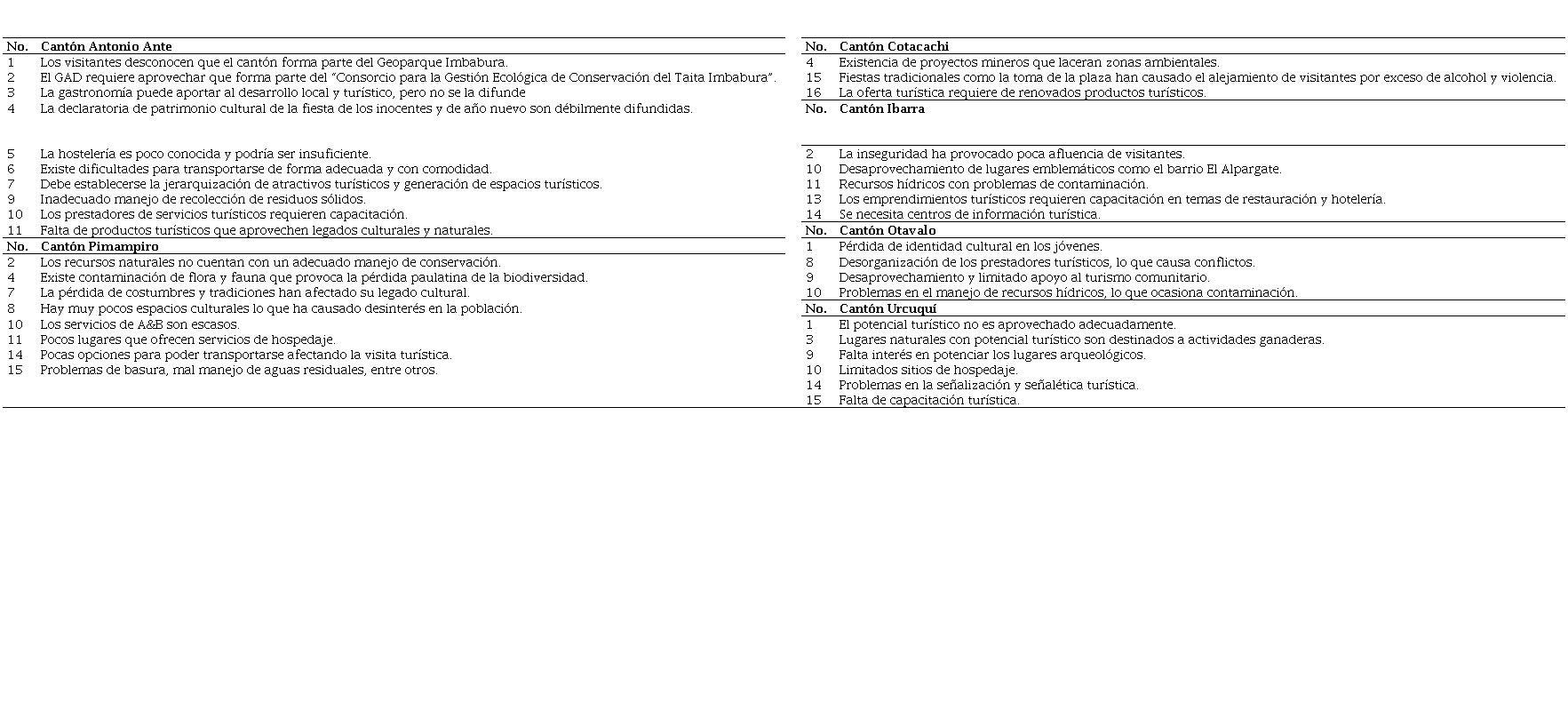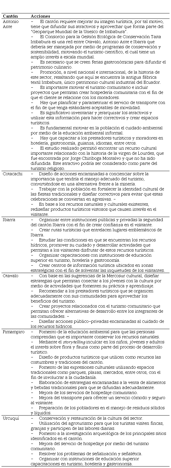 En la Tabla 4 se presentan las acciones sugeridas para la mejora turística en los cantones de la provincia de Imbabura.