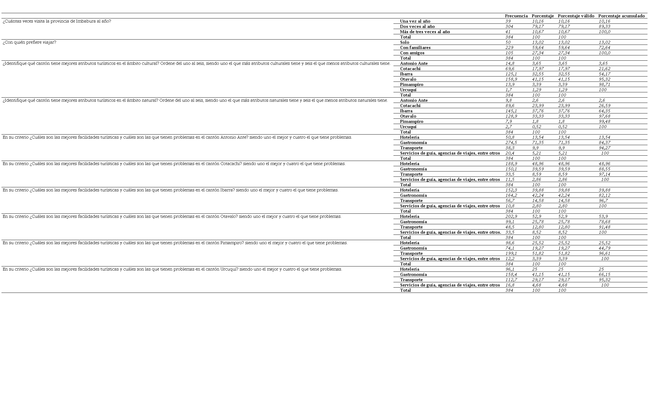 Por otra parte, la encuesta tiene la ventaja que utiliza diferentes herramientas que pueden agilizar el procesamiento de datos, como lo menciona García Ferrando (1993), su importancia es clave en la construcción de conocimiento. En este sentido, los resultados obtenidos fueron de gran aporte porque se logró establecer que una gran mayoría visita dos veces al año la provincia de Imbabura, y lo hace con su familia; coincidentemente, llegan por los atributos culturales y naturales, especialmente a Otavalo, Ibarra y Cotacachi, siendo los lugares menos frecuentados Antonio Ante, Pimampiro y Urcuquí. Por otra parte, las facilidades turísticas con problemas son los servicios de guía, agencias de viajes y el transporte.
