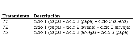 En Colombia, es común que los requerimientos de cal sean de 500 hasta 5.000 kg ha-1, cabe resaltar que este rango es bastante amplio, razón por la cual su aplicación se define de acuerdo al análisis de suelo y del cultivo a implementar (Osorno Henao, 2012). De acuerdo con la recomendación incluida en el análisis del suelo, se aplicó una enmienda de 800 kg ha-1 de cal dolomita [CaMg (CO.).] antes de establecer el cultivo inicial de papa en los tres tratamientos. Cabe resaltar que esta práctica agronómica es realizada por los agricultores antes del establecimiento del cultivo. Las UE se sembraron con semilla de papa de calidad certificada de la variedad comercial Diacol Capiro, la fertilización se realizó de forma convencional a la aplicada por los agricultores de la zona (NO. 234 – P.O. 486 – K.O 240 – MgO 23 kg ha–1). El cultivo de avena (Avena sativa L.) se sembró con la variedad comercial tipo forrajera Cayuse con la técnica “al voleo” y a una densidad de siembra de 88 kg ha-1. Para el cultivo de la arveja (Pisum sativum L.) se empleó la variedad comercial tipo Santa Isabel con un hábito de crecimiento voluble (Buitrago et al., 2006; Ligarreto y Ospina, 2009). En la avena y arveja no se utilizó fertilización.